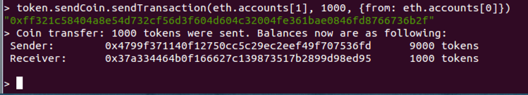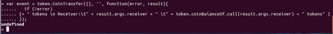 console.log("Coin transfer: " + result.args.amount + " tokens were sent. Balances now are as following: \n Sender:\t" + result.args.sender + " \t" + token.coinBalanceOf.call(result.args.sender) + " tokens \n Receiver:\t" + result.args.receiver + " \t" + token.coinBalanceOf.call(result.args.receiver) + " tokens" )