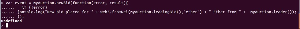 console.log("New bid placed for " + web3.fromWei(myAuction.leadingBid(),"ether") + " Ether from " + myAuction.leader());