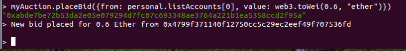 myAuction.placeBid({from: personal.listAccounts[0], value: web3.toWei(0.6, "ether")})