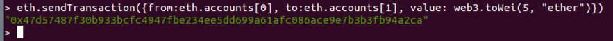 eth.sendTransaction({from:eth.accounts[0], to:eth.accounts[1], value: web3.toWei(5, "ether")})