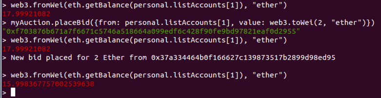 myAuction.placeBid({from: personal.listAccounts[1], value: web3.toWei(2, "ether")})