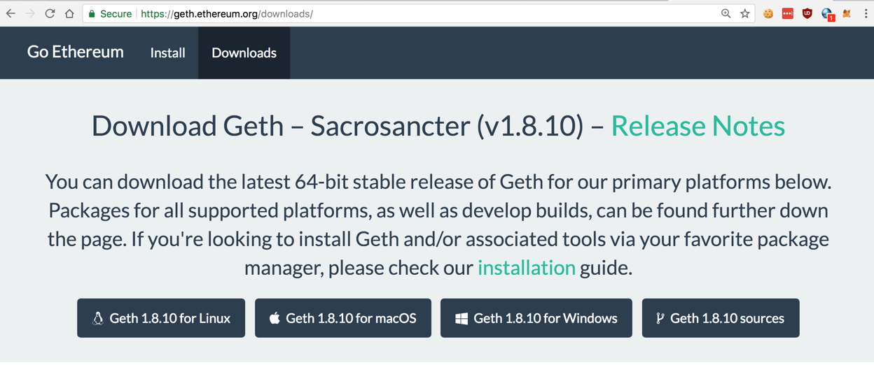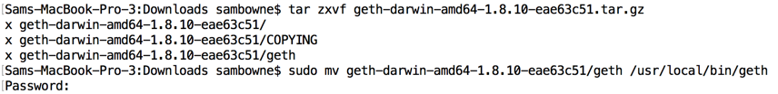 tar zxvf geth-darwin-amd64-1.8.10-eae63c51.tar.gz sudo mv geth-darwin-amd64-1.8.10-eae63c51/geth /usr/local/bin/geth