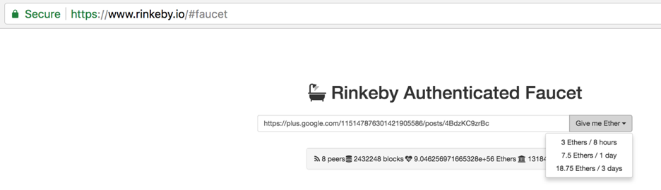 Enter the URL to your Google+ post and click "Give me Ether", "3 Ethers / 8 Hours", as shown below.