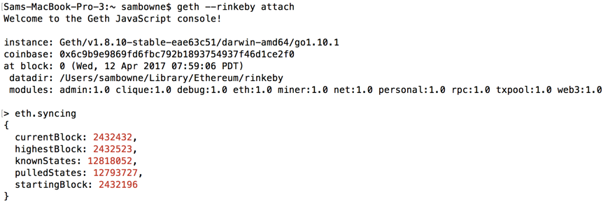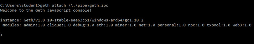 Open a new Terminal window, and execute this command:A geth console opens, with a > prompt, as shown below.