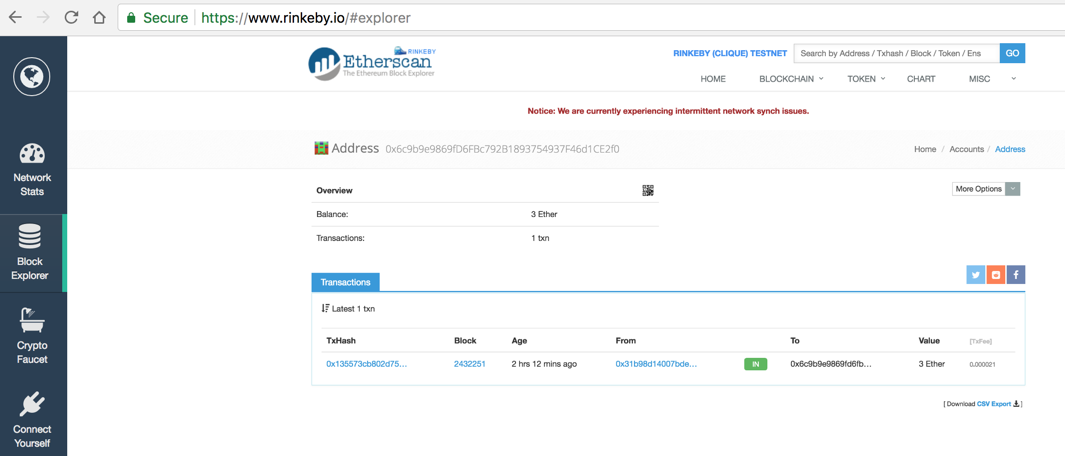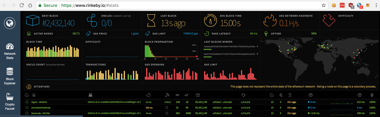 The Rinkeby test chain appears, as shown below. At the top left, notice the current block. When I did it, on June 9, 2018, it was 2,432,140.