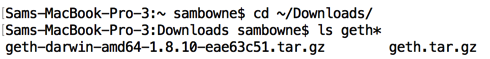 In a Terminal window, execute these commands.Find the full name of the file. When I did it, it was "geth-darwin-amd64-1.8.10-eae63c51.tar.gz", as shown below.