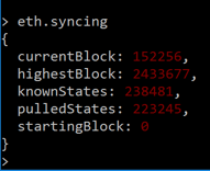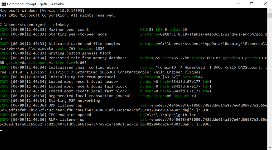 Open a Command Prompt window and execute this command, which starts your local Ethereum node, and begins to download the Rinkeby test chain, as shown below.
