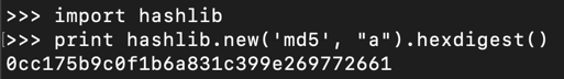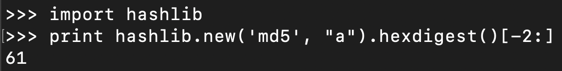 print hashlib.new('md5', "a").hexdigest()[-2:]