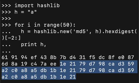 If you hash a starting value, and then hash that hash, and repeat this process, you don't keep getting different numbers forever. Eventually you get a repeated value, and after that all further values are repeats, going in a loop, as shown below.
