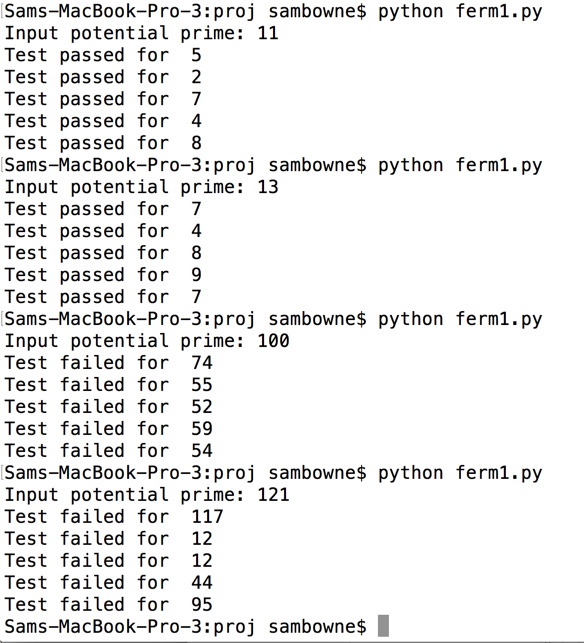 As shown below, 11 and 13 pass all the tests because they are prime, but 100 and 121 fail because they aren't.