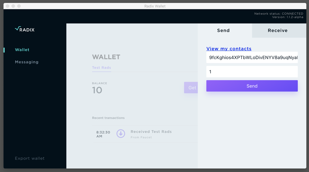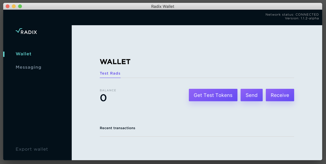 The wallet should connect to the test network automatically, showing CONNECTED in the top right corner, as shown below.