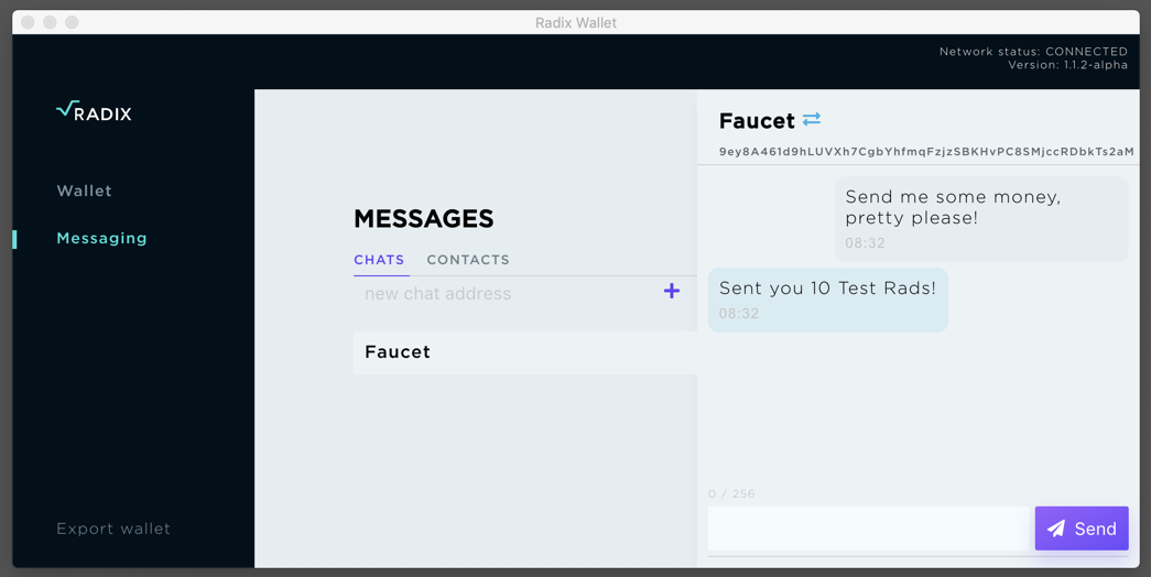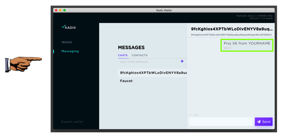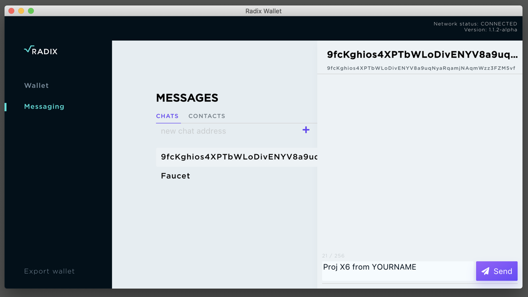 In the "Messages" window, on the "CHATS" tab, enter my address into the field, as shown below.
