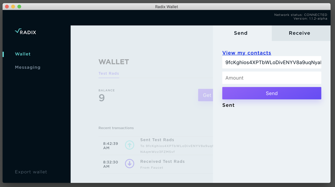 Click Send. The transfer should complete quickly, showing a "Sent" message, as shown below.