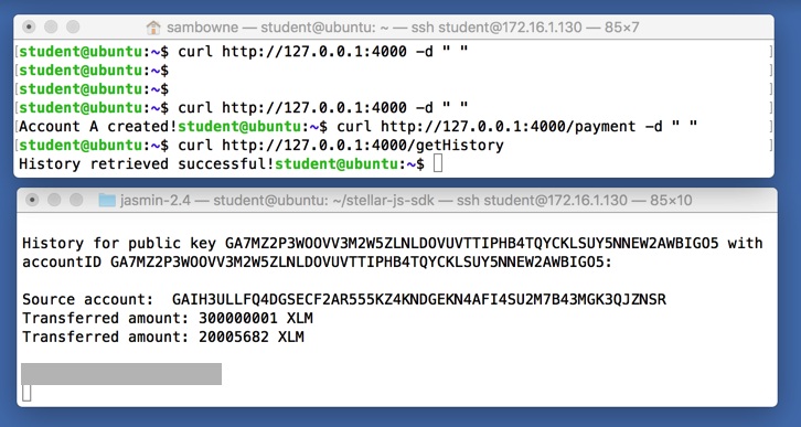 The original Terminal window shows two transactions: first 300000001 XLM into the account, and then 20005682 XLM out of it, as shown below.