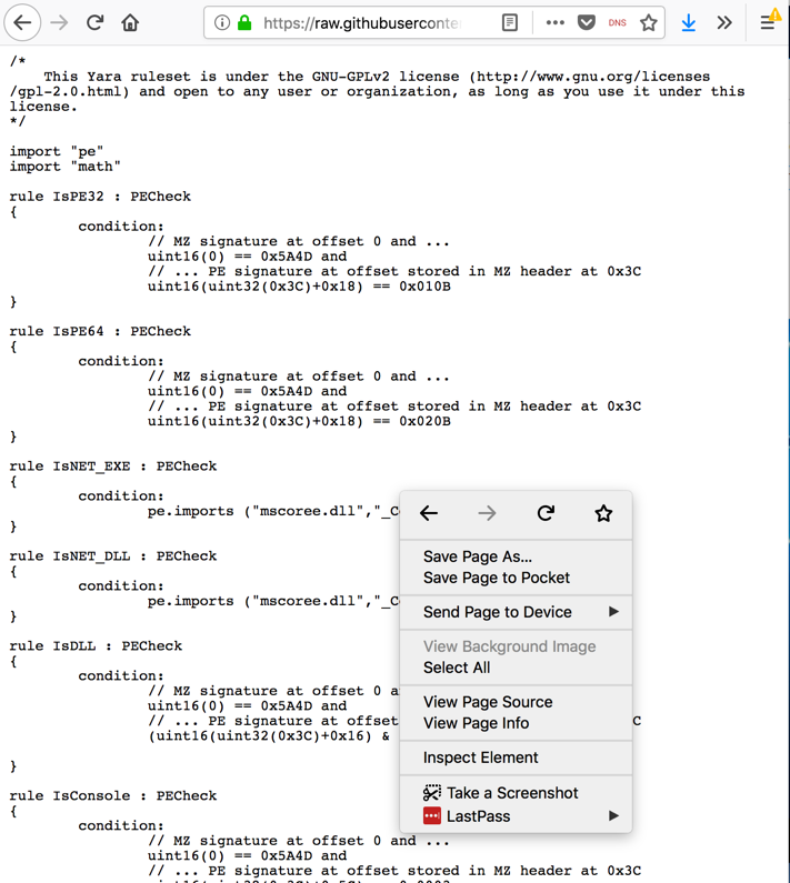 Right-click inside the Web page and click "Save Page As.... Save the page in your Downloads folder with its default name, which is packer_compiler_signatures.yar