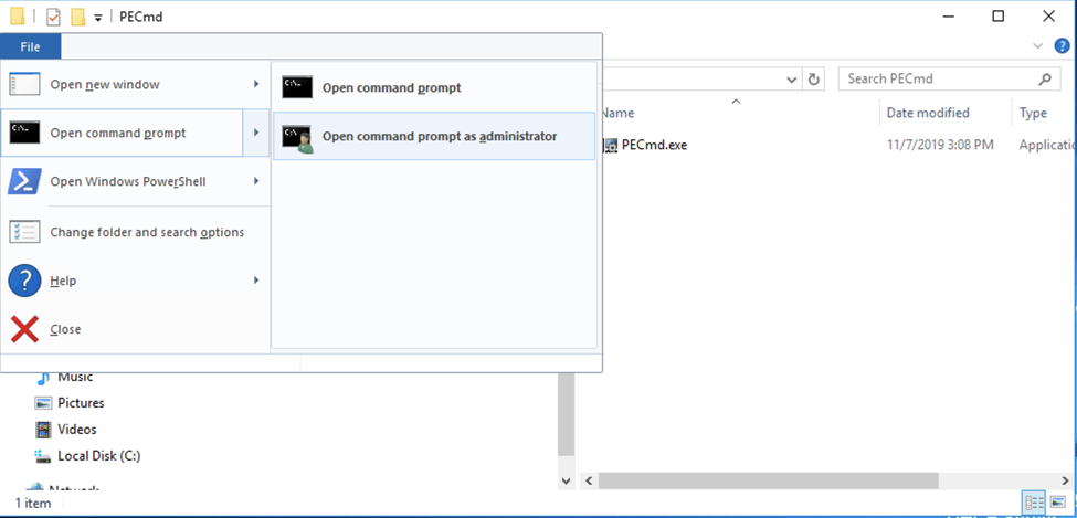 At the top left, click File. Point to "Open command prompt", and click "Open command prompt as administrator", as shown below.