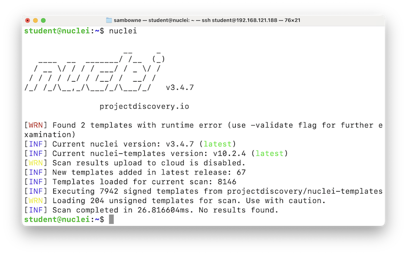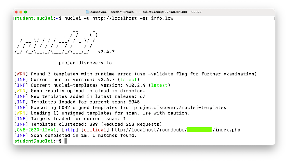 On your Linux machine, execute the commands below.The "-es info,low" switch tells Nuclei not to bother with unimportant findings.