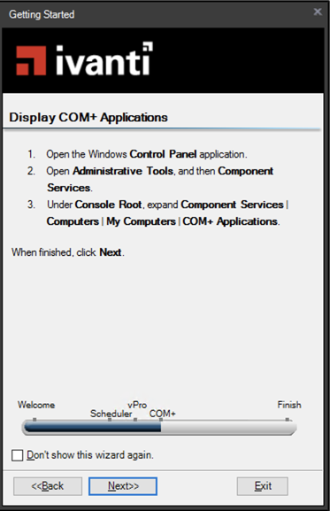 In the "Getting Started" box, at the "Restart the LANDesk COM+ Application" page, follow the instructions and click Next.