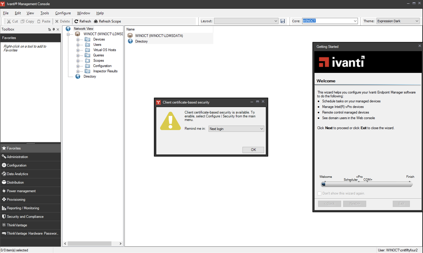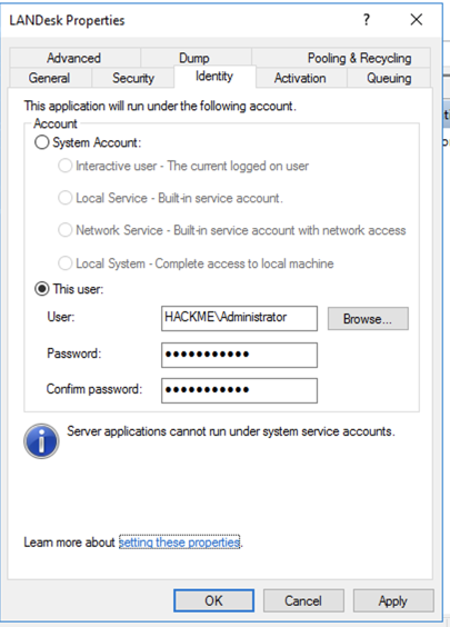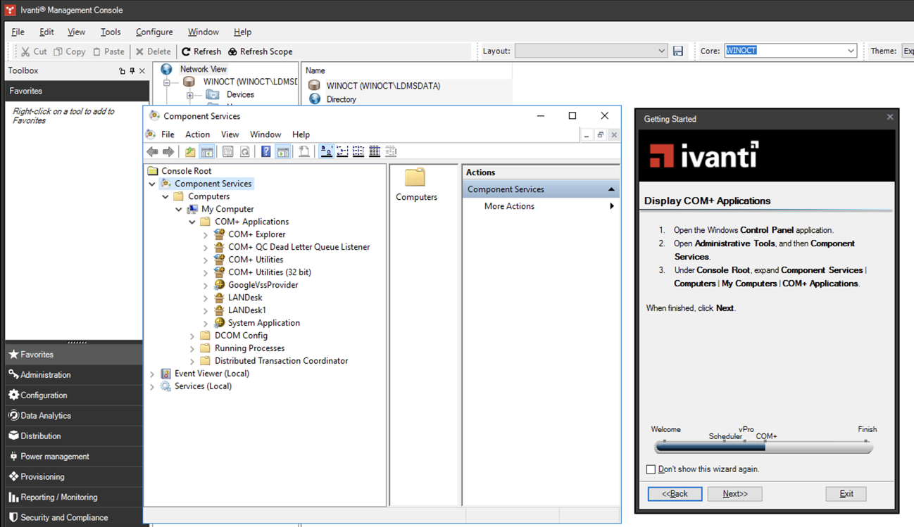 In the "Getting Started" box, at the "Restart the LANDesk COM+ Application" page, follow the instructions and click Next. In the "Getting Started" box, at the "Configure the LANDesk1 COM+ Application" page, follow the instructions to enter your Domain Administrator credentials.