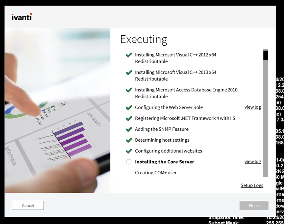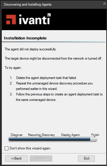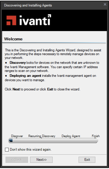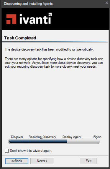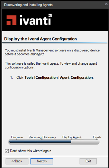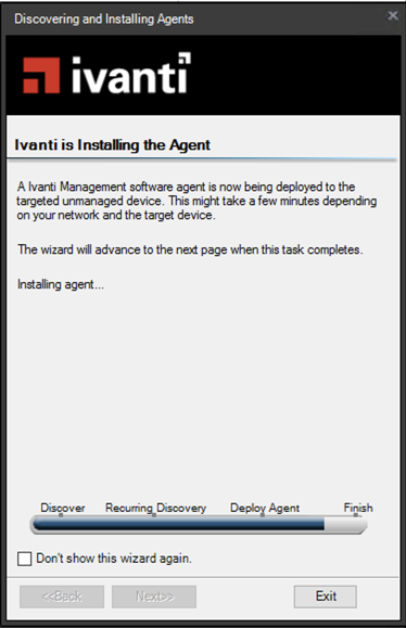 In the "Discovering and Installing Agents" wizard, the "Ivinti is Installing the Agent" page appears, as shown below.
