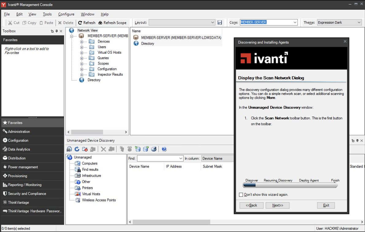 At the bottom of the window, the "Unmanaged Device Discovery" pane appears.