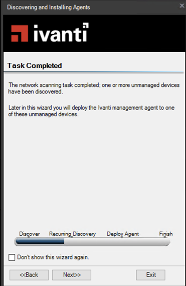 In the "Discovering and Installing Agents" wizard, the "Task Completed" box appears, saying "one or more unmanaged devices have been discovered", as shown below.