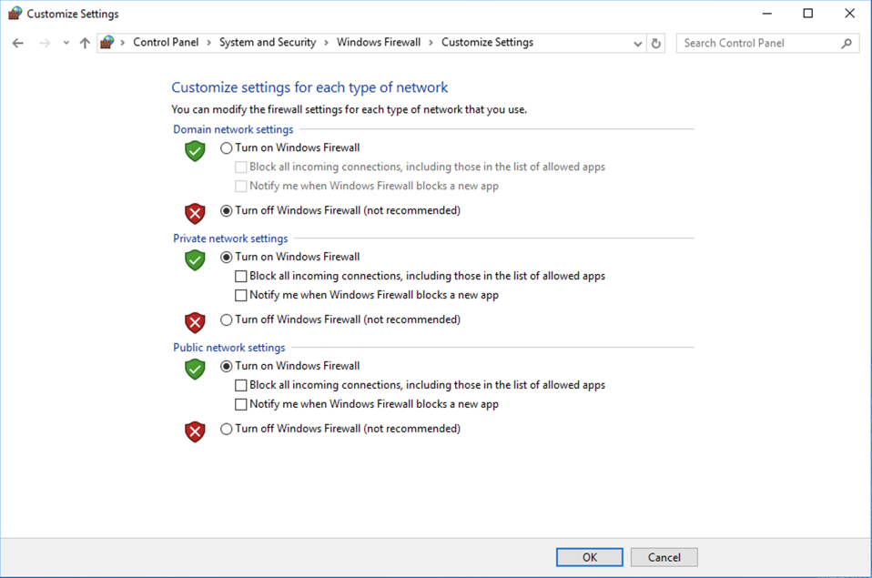In the "Domain network settings" section. click "Turm off Windows Firewall (not recommended)", as shown below.