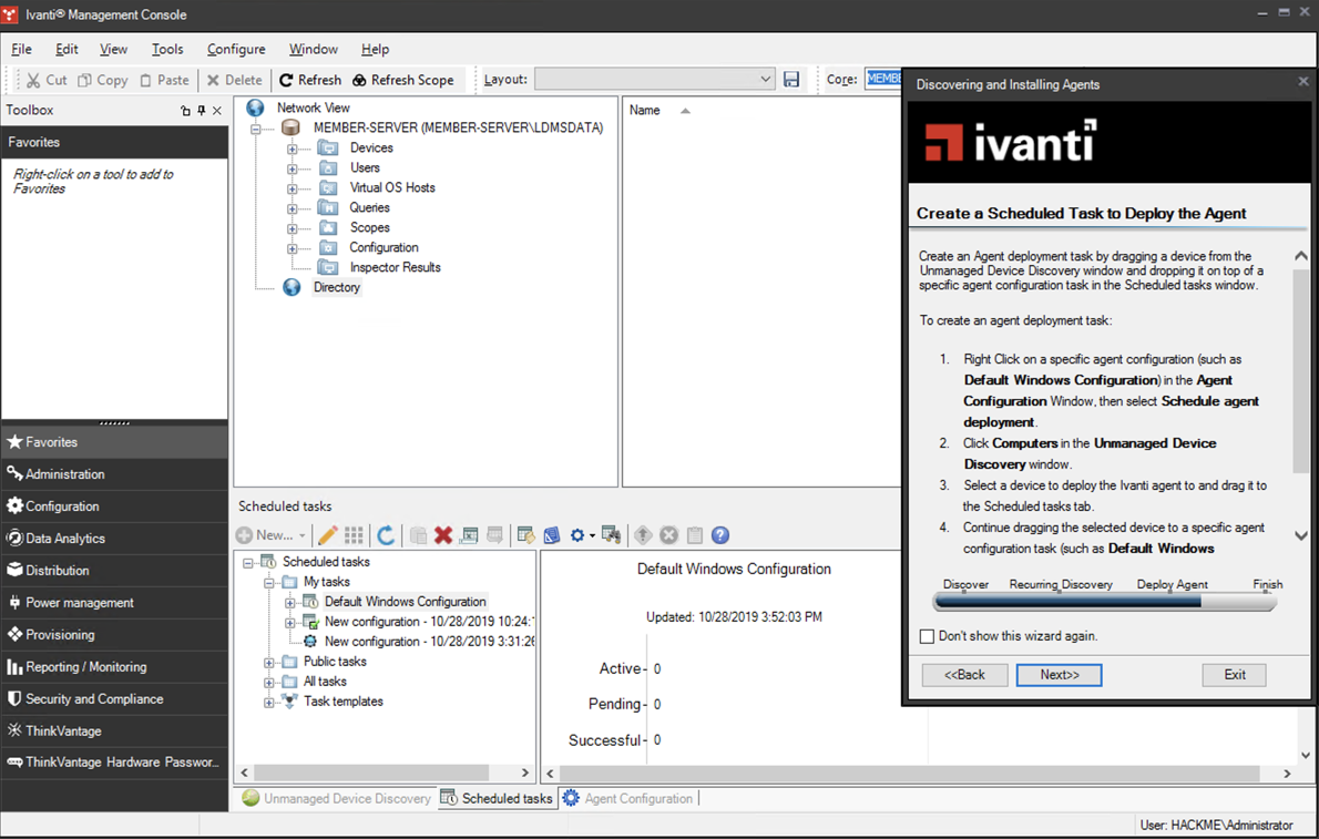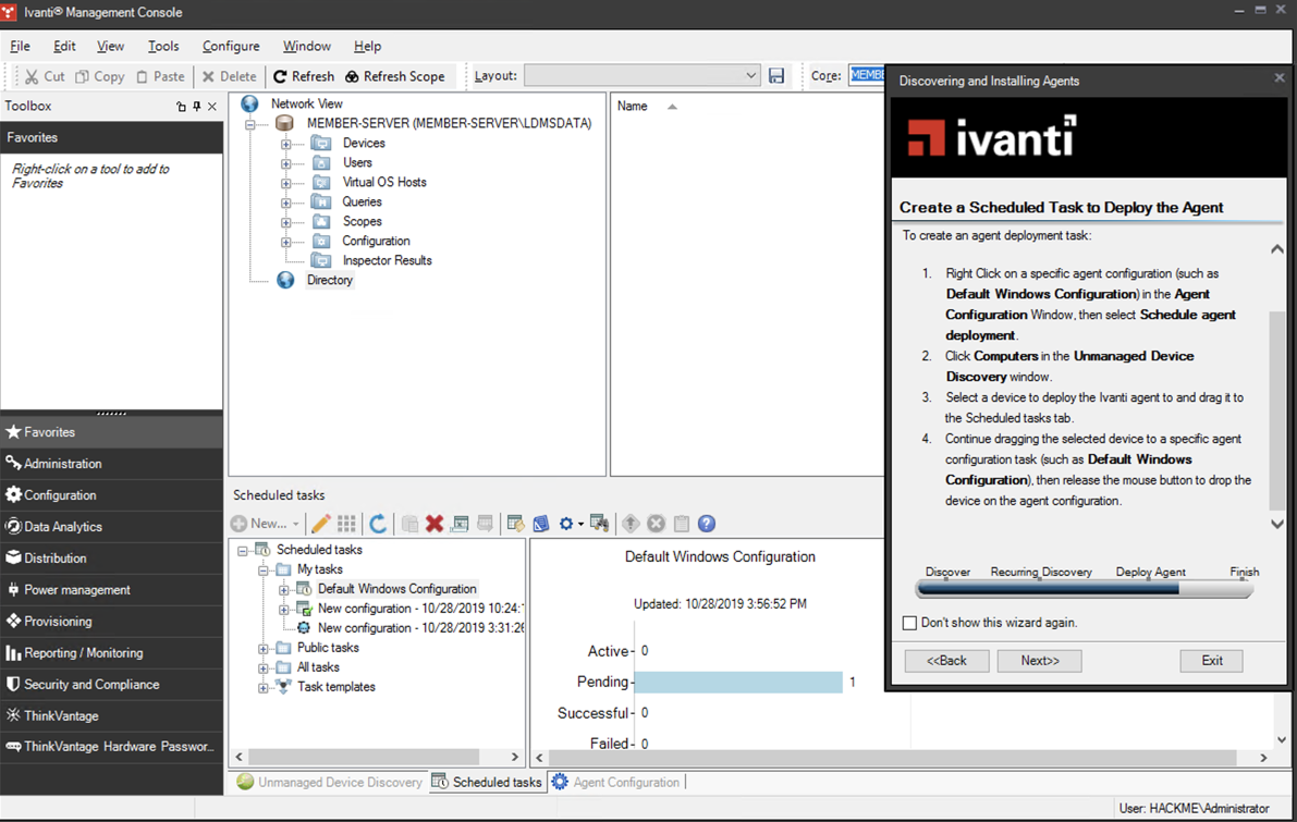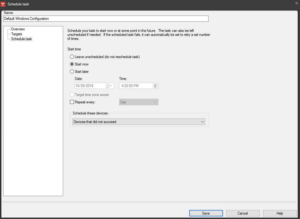 In the Ivanti Management Console, at the bottom, in the Scheduled Tasks panel, in its left pane, right-click "Default Windows Configuration" and click Properties.