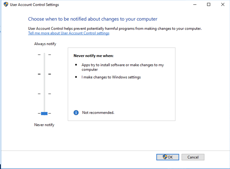 In the "User Account Control Settings" box, drag the slider to the bottom, as shown below.
