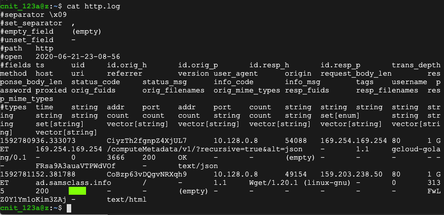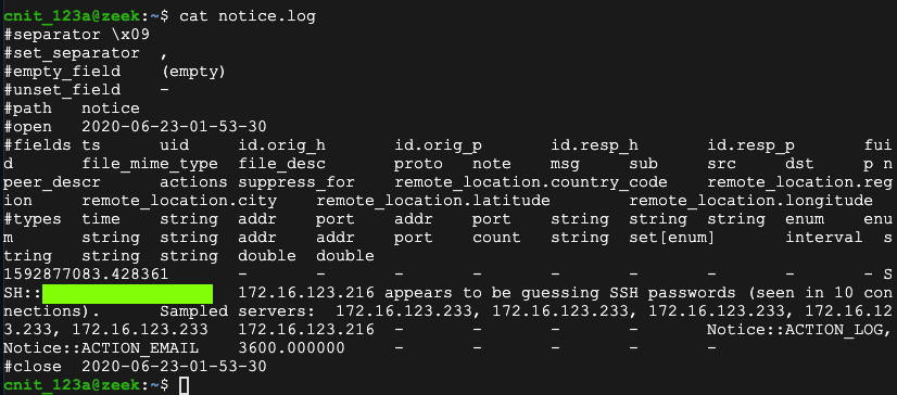wget https://samsclass.info/152/proj/ssh-brute.pcap sudo /opt/zeek/bin/zeek -r ssh-brute.pcap -C notice_ssh_guesser.zeek cat notice.log