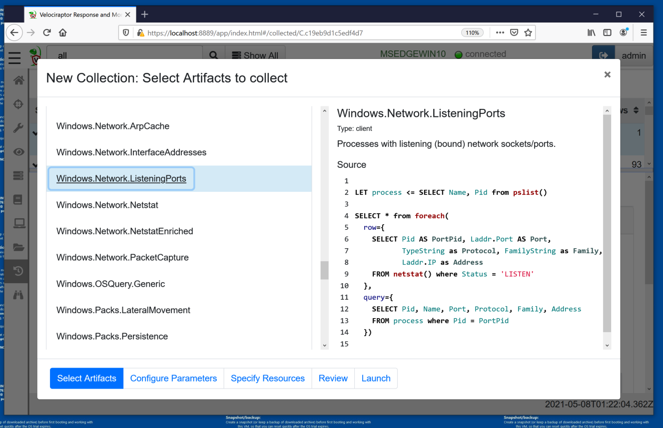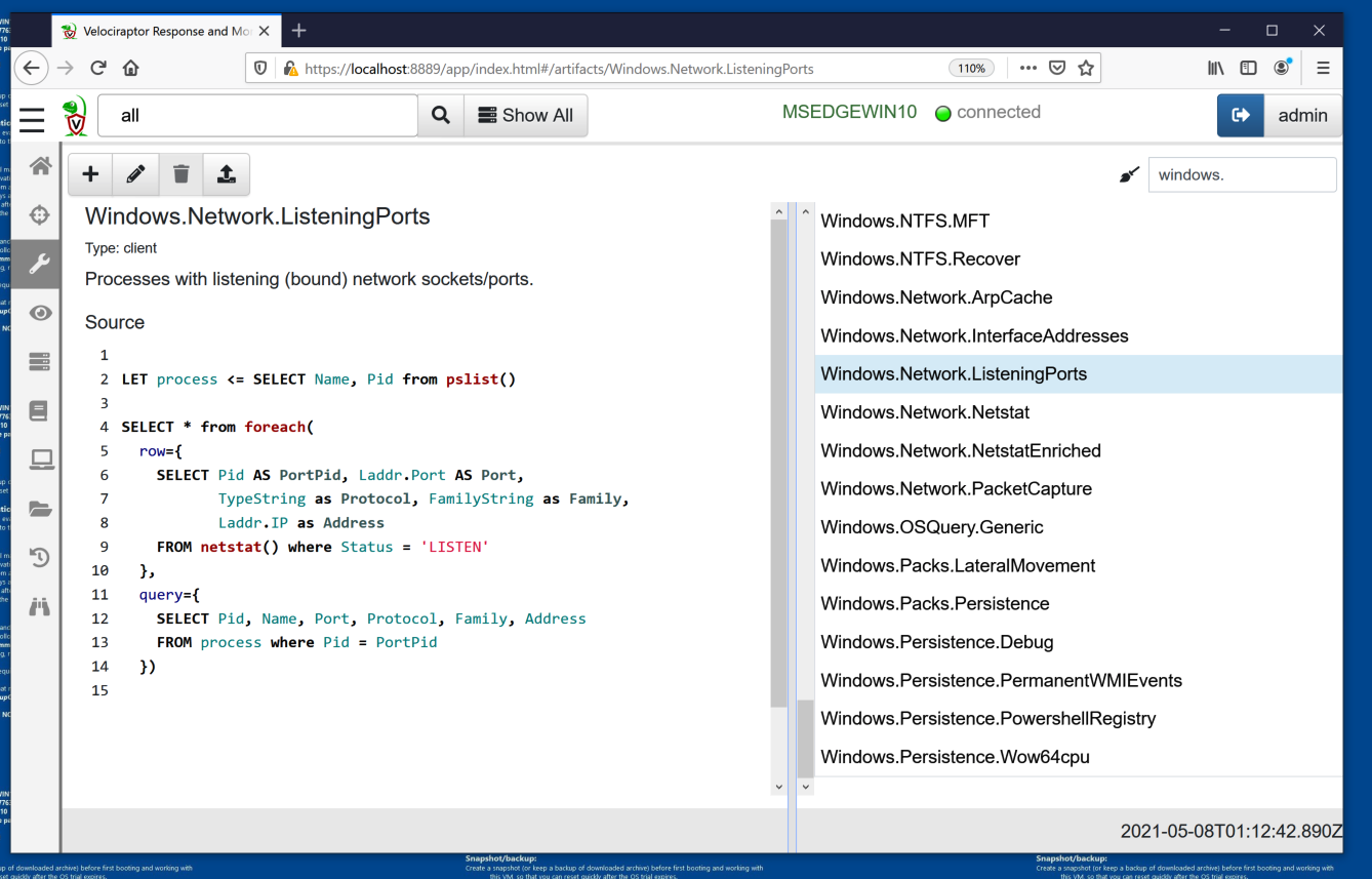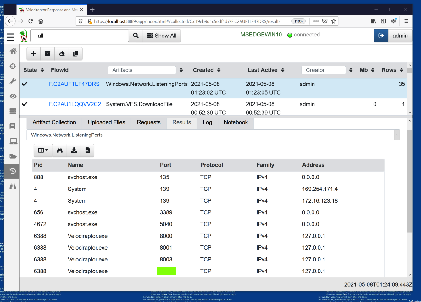 In the top pane, find the Windows.Network.ListeningPorts artiface and click the blue Flowid number on its line.The lower pane shows the listening processes on your Windows machine, as shown below.