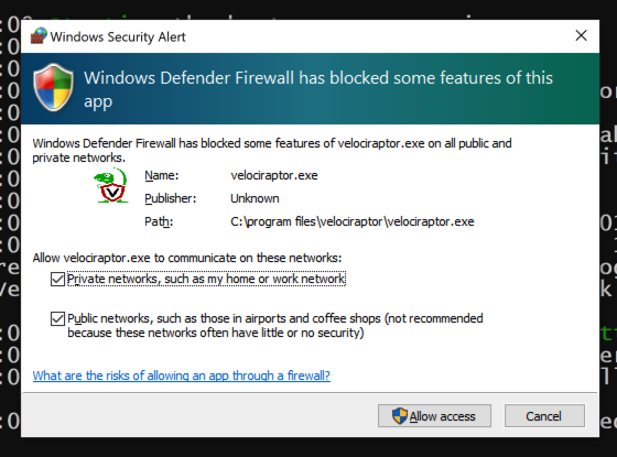 If a box pops up from Windows Defender Firewall, check both network type boxes and click "Allow access", as shown below.