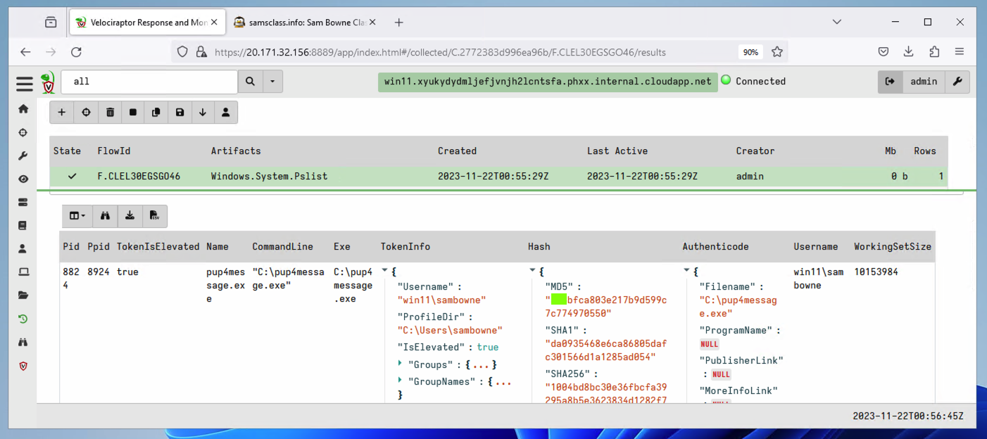 Launch this collector:Windows.System.PslistFind the MD5 hash of the EXE used to launch the process. From the previous flag, you know the executable is named PUP4message.exe, so configure a ProcessRegex of PUPThe flag is covered by a green rectangle in the image below.