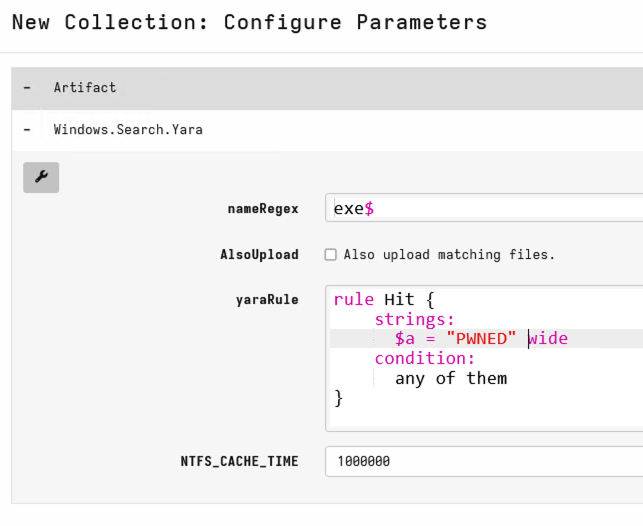 Windows.Search.YaraFind all EXE files containing the Unicode string "PWNED", as shown below.