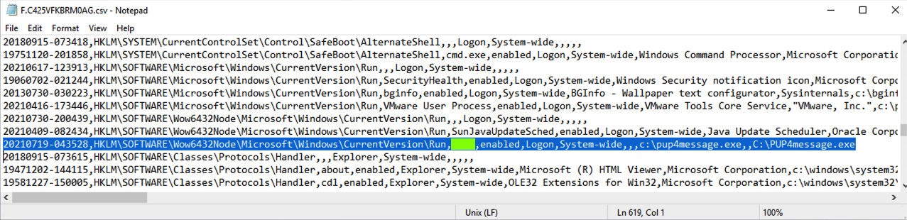 Open the CSV with Notepad or another text editor and find the Run key used to launch PUP4message.exe.The flag is covered by a green rectangle in the image below.