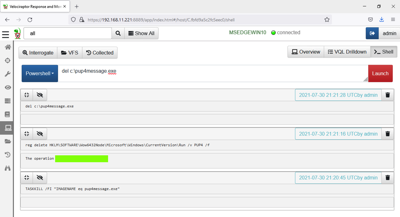 The purpose of this step is to remove the malware from the client.Look at the Windows client. The pop-up message is still there! The Velociraptor shell doesn't seem to work for this purpose.