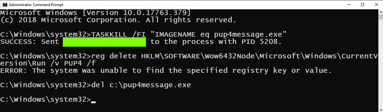 TASKKILL /FI "IMAGENAME eq pup4message.exe"The flag is covered by a green rectangle in the image below.reg delete HKLM\SOFTWARE\Wow6432Node\Microsoft\Windows\CurrentVersion\Run /v PUP4 /f
