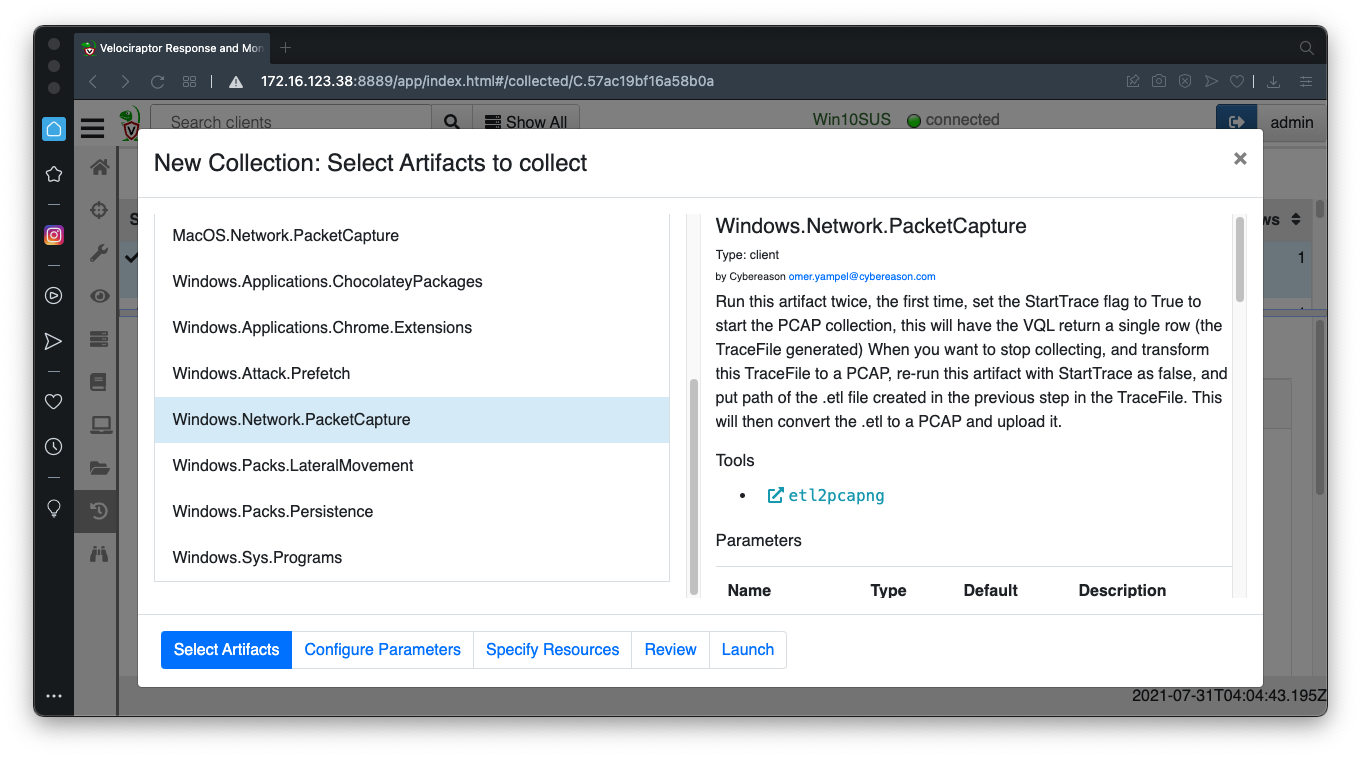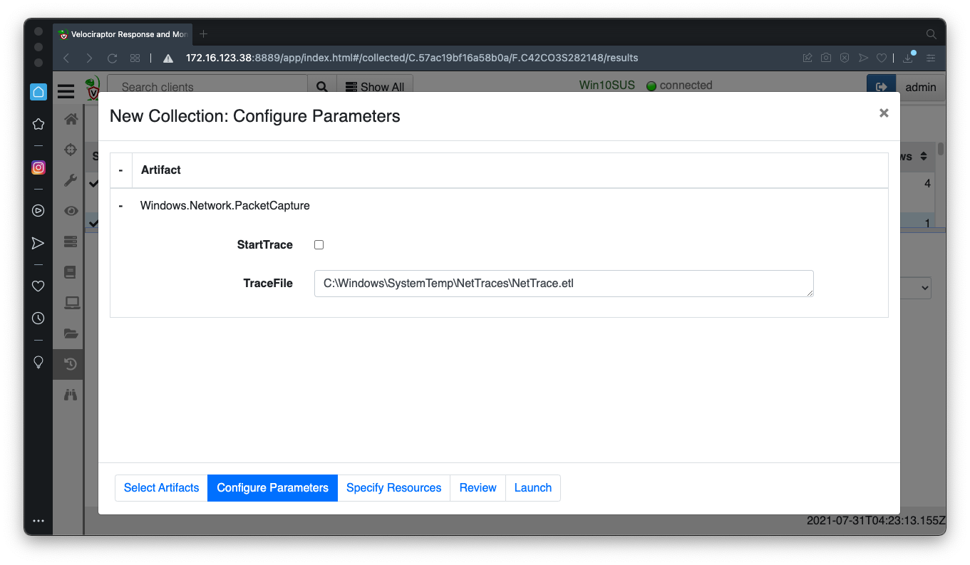 Launch the collector without changing the parameters. This starts capturing packets on the Windows machine.