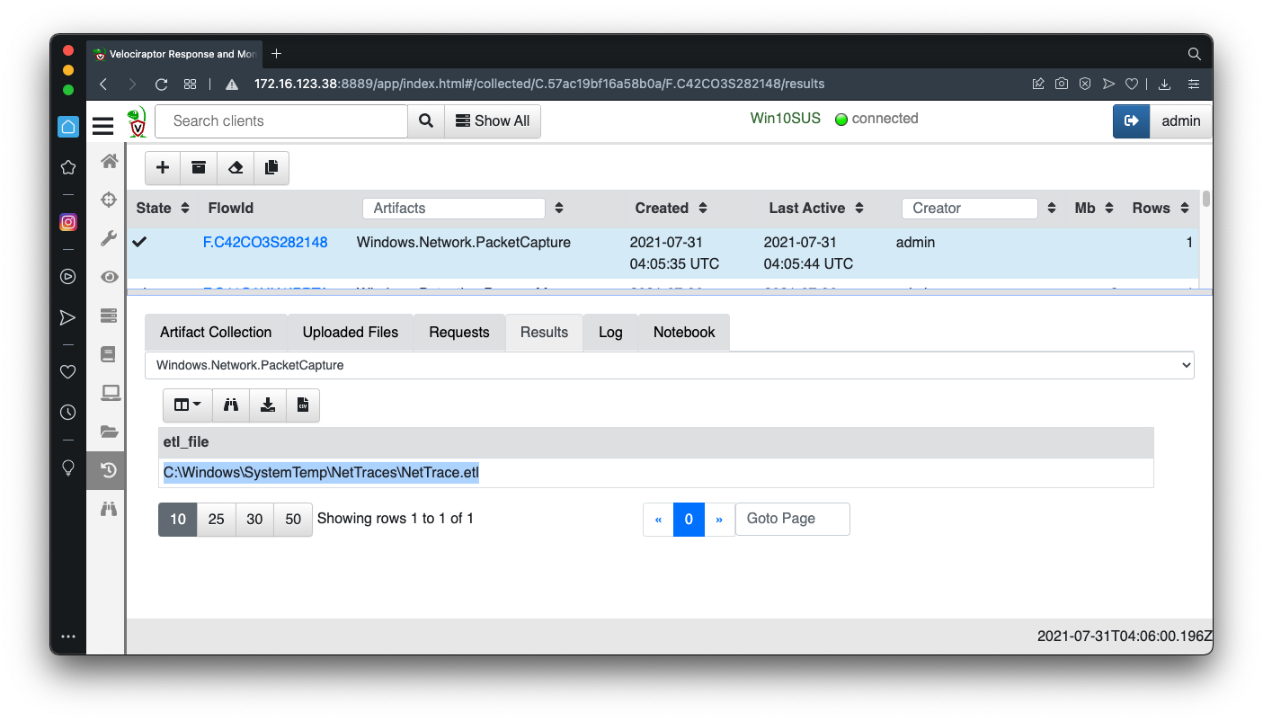 When it finishes, click the "Uploaded Files" tab. A link appears to a .pcapng file, as shown below.