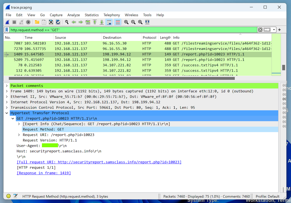 Find the requests to a subdomain of "samsclass.info".http.request.method == "GET"Expand the packet details to find the User-Agent. That's the flag, as shown below.