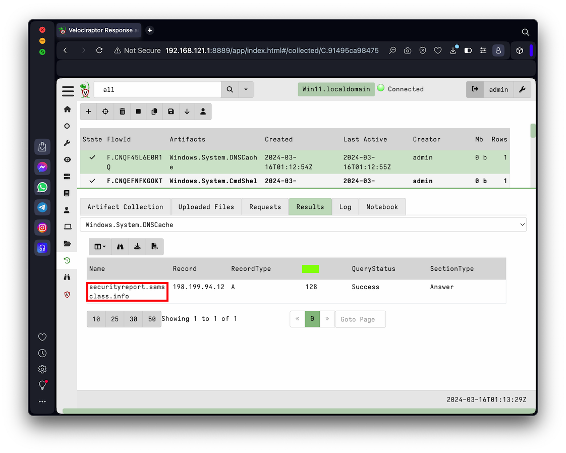 Next, we'll find the domain name of the C &amn; C server in the DNS cache.Launch this collector, with no parameter changes.