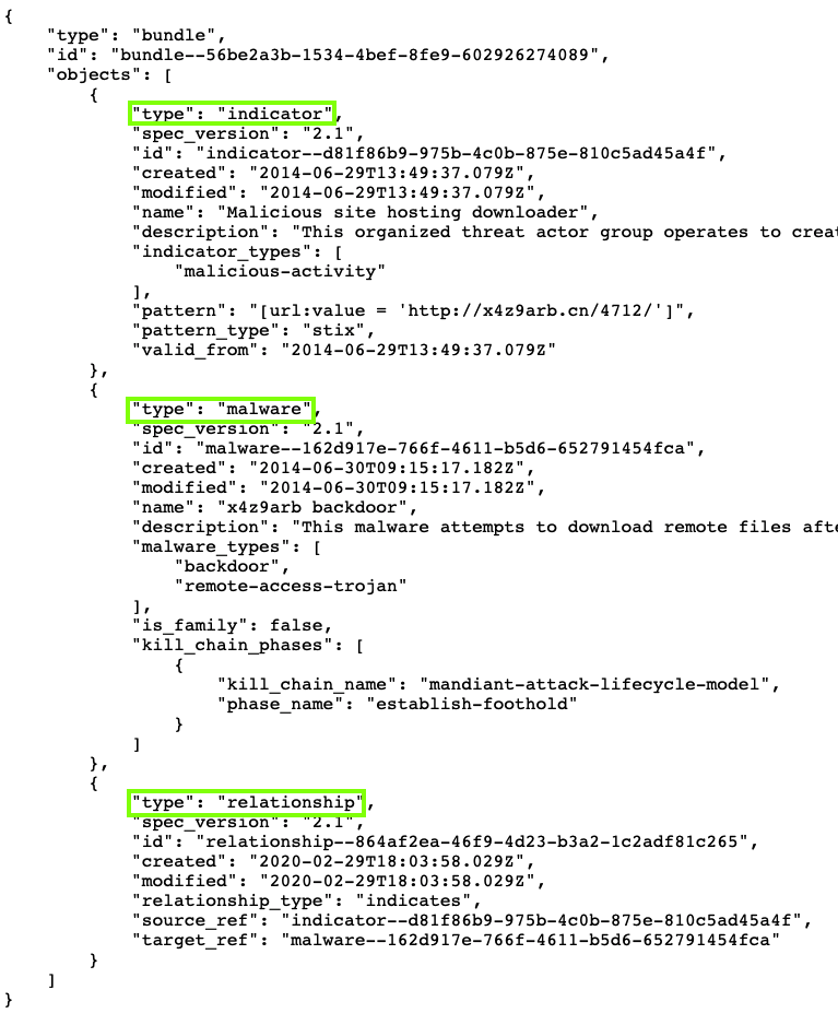 There are three objects, with types of indicator, malware, relationship, outlined in green in the image below.