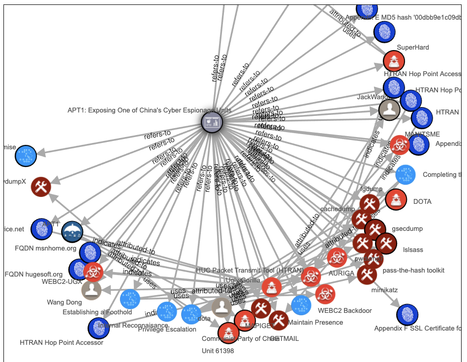 Examine this STIX file in the visualizer.https://oasis-open.github.io/cti-documentation/examples/example_json/apt1.jsonThis is a big chart from the original APT1, the 2010 report from Mandiant that shocked the world and launched the modern field of Incident Response.Find these flags. Each flag is worth 5 pts.