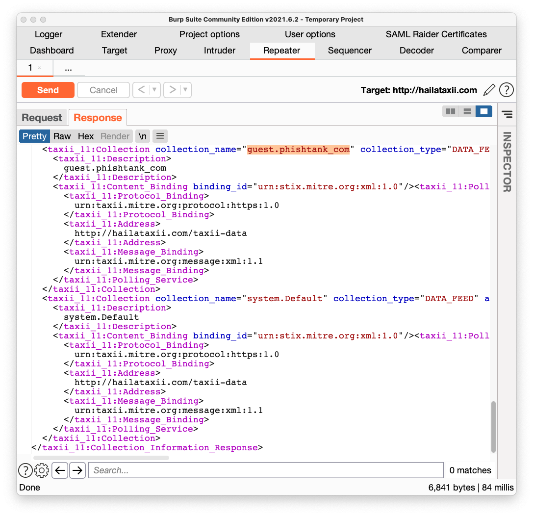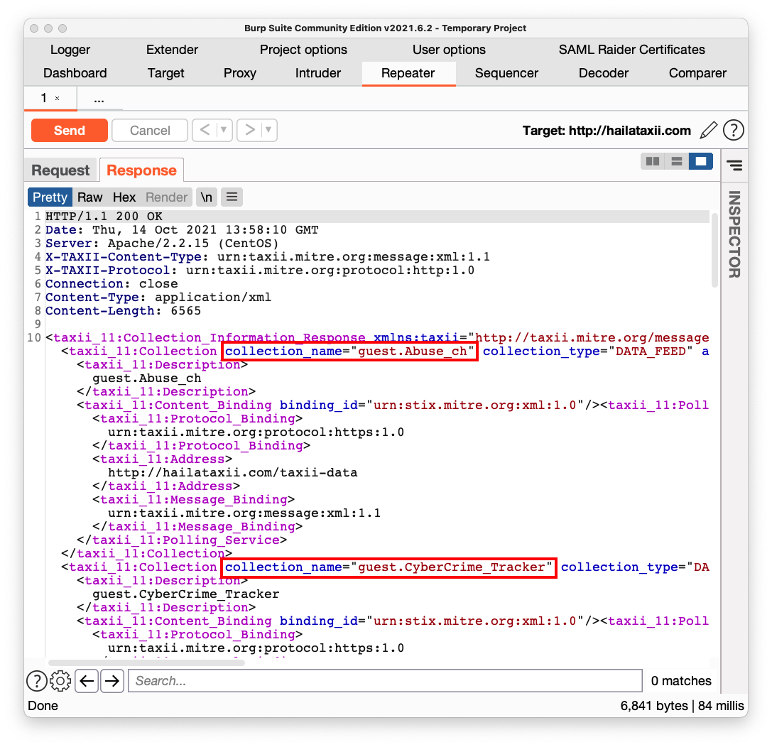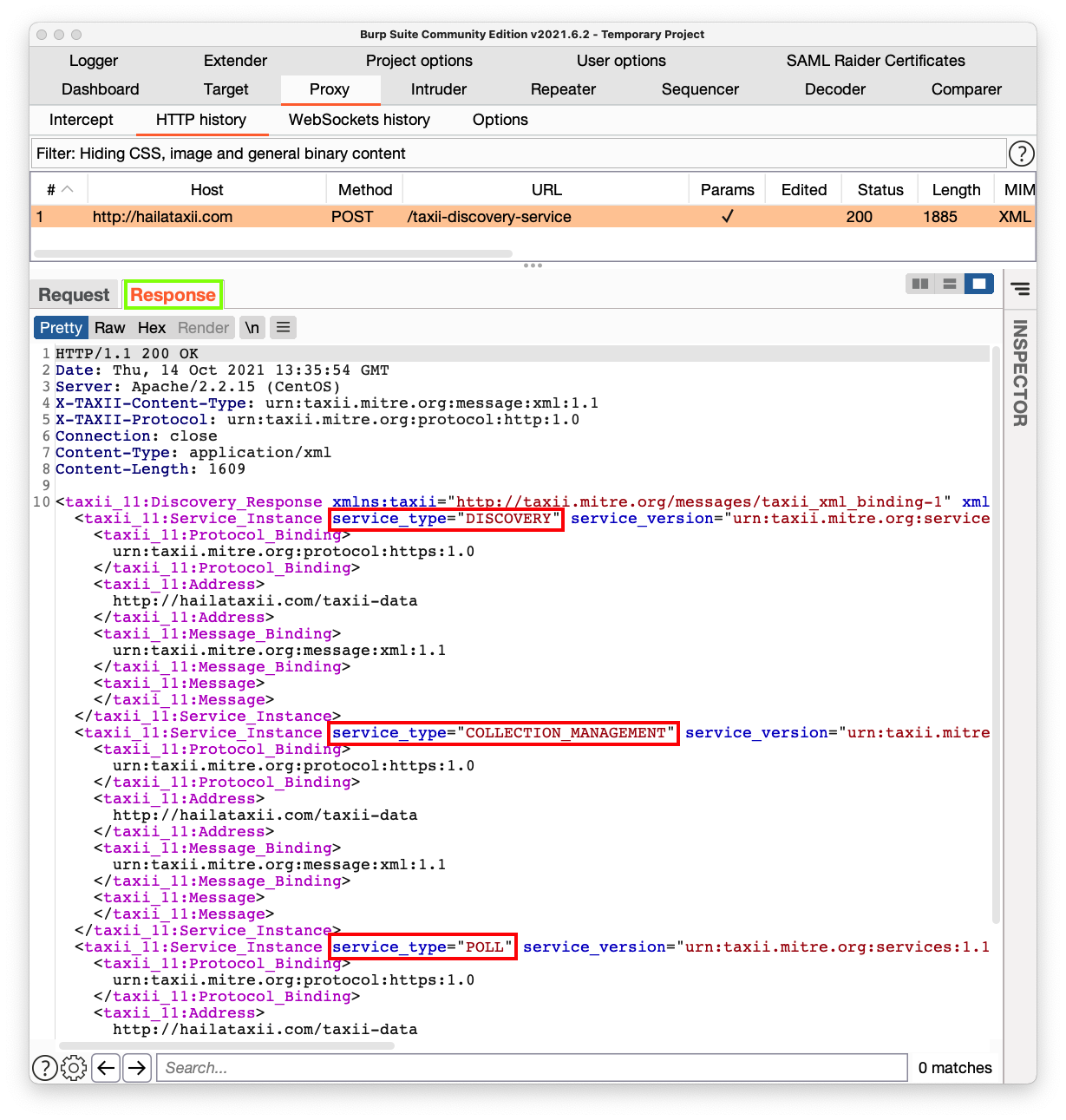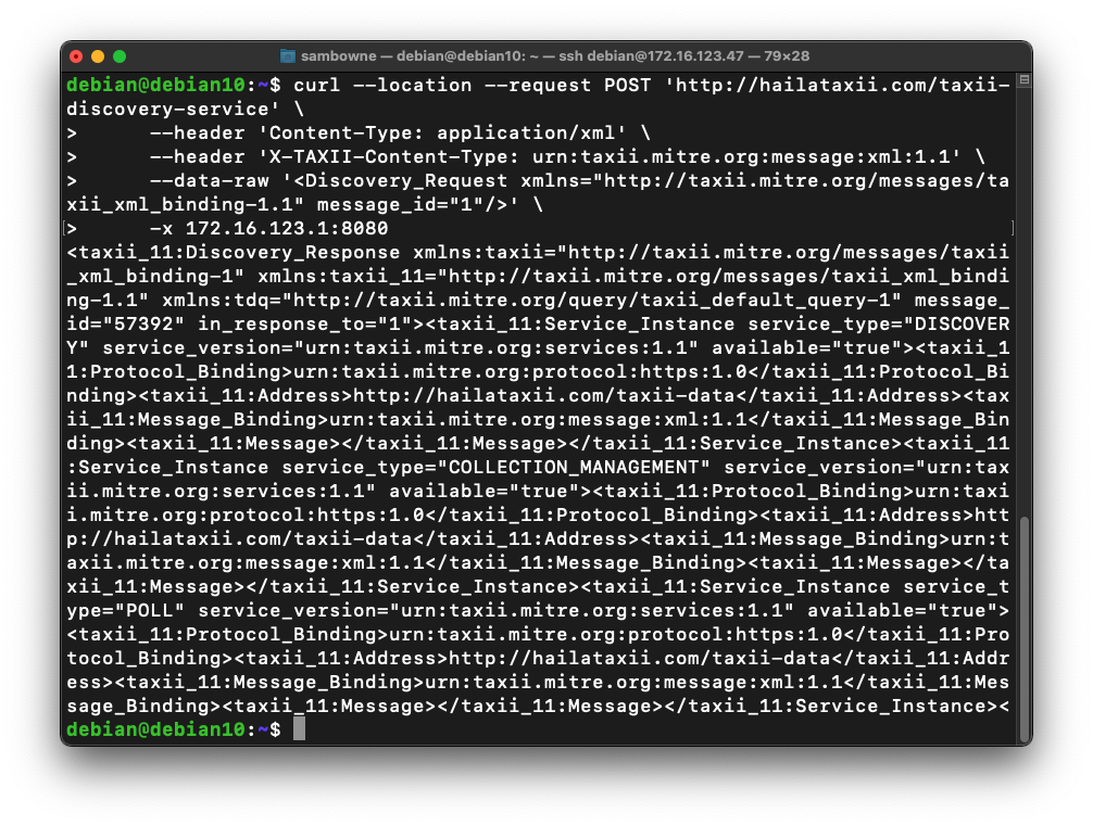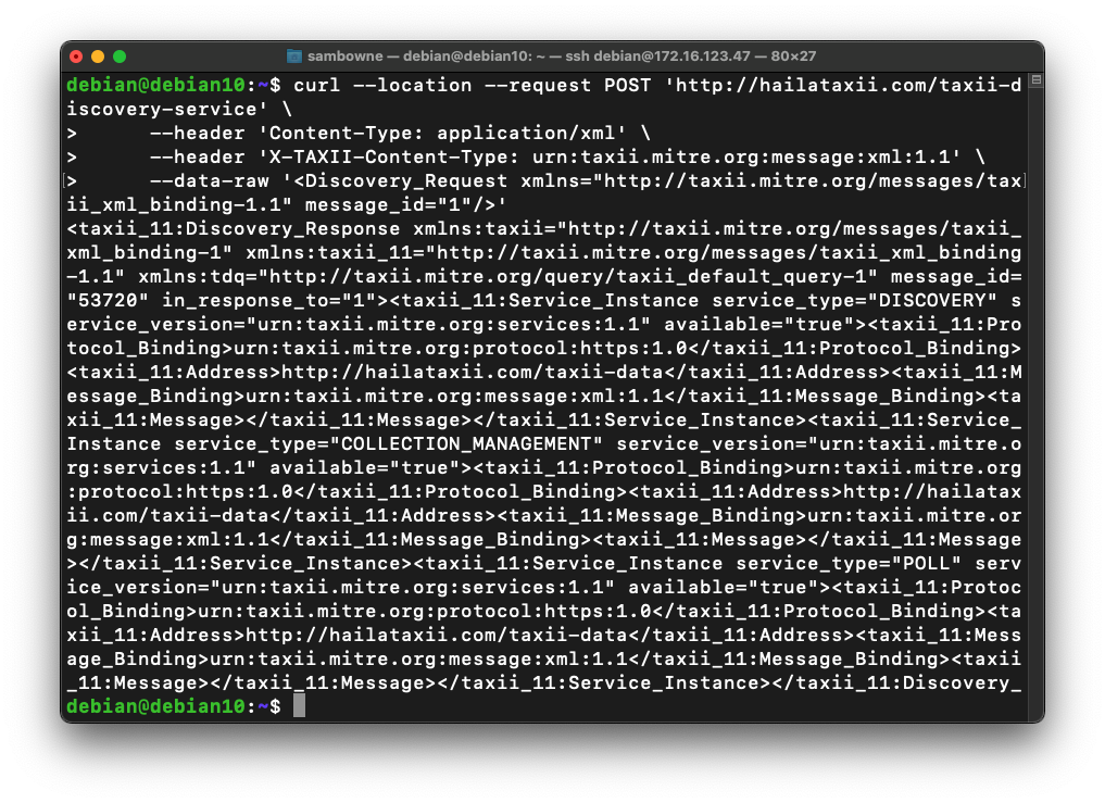 This is the response from the TAXII server. This server offers three services, outlined in red in the image below: