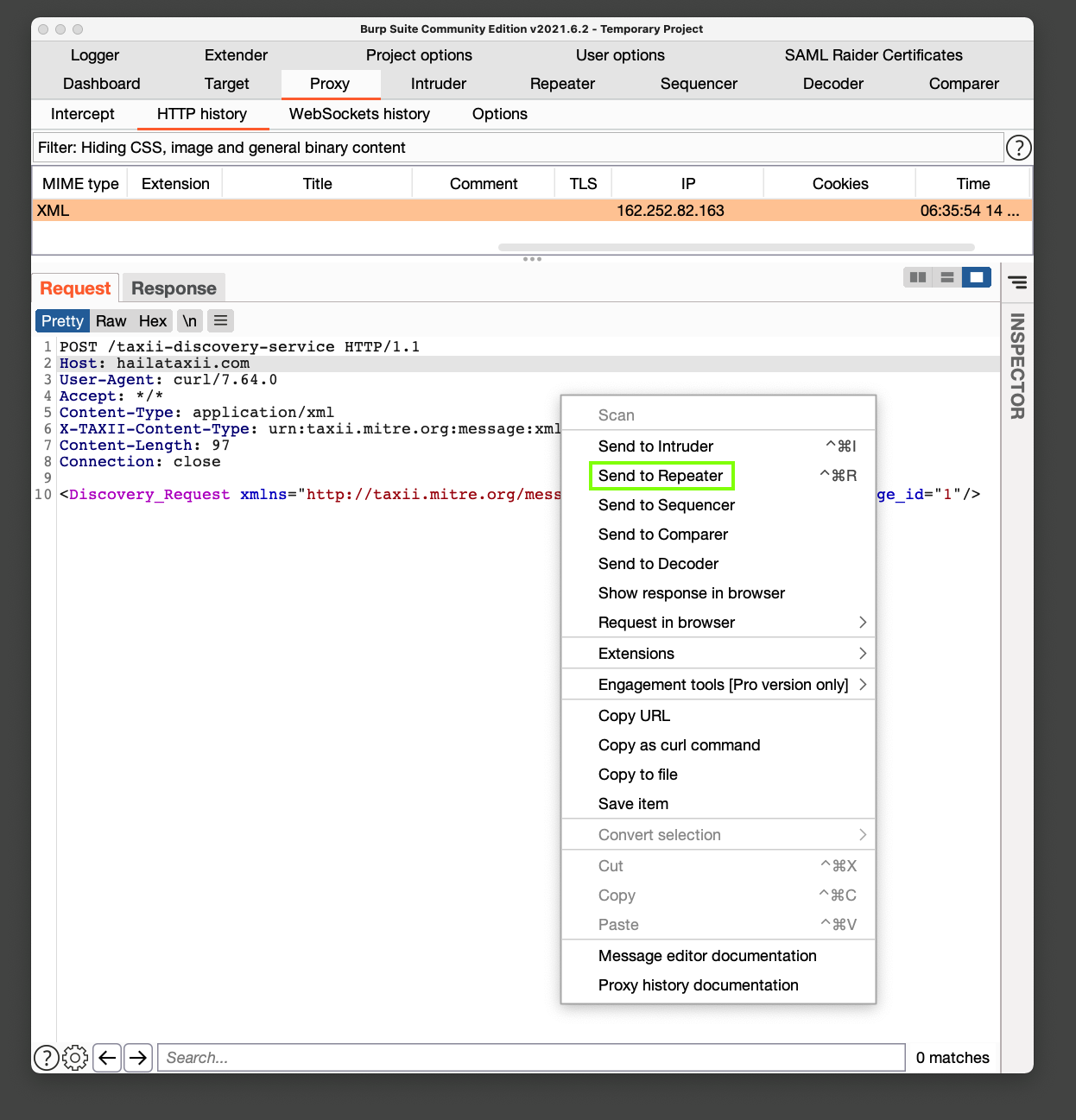 In the lower pane, right-click and click "Send to Repeater", outlined in green in the image below.