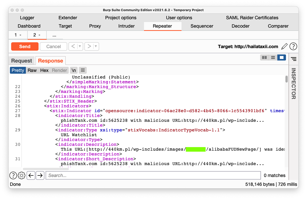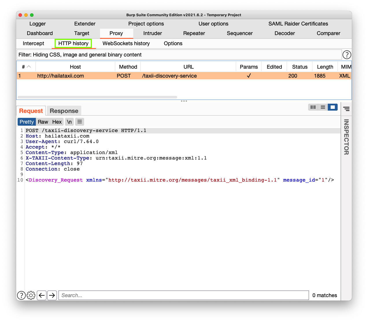 In the center pane, you see a line showing a POST request to "http://hailataxii.com". Click that line to highlight it, as shown below.
