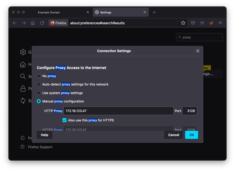 In the Connection Settings box, in the HTTP proxy field, enter your proxy's IP address and a Port of 3128, as shown below.