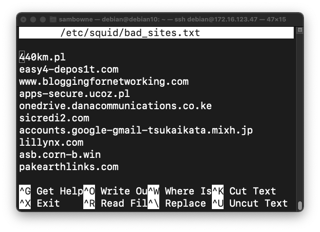 In IR 382, you collected URLs from Phishtank for the time range 2:00 - 2:10 on 2018-05-25. These are "Indicators of Attack" -- traffic to these domains indicate phishing attempts in progress.Generate a list of domain names from those URLs and put them into the /etc/squid/bad_sites.txt file, as shown below.