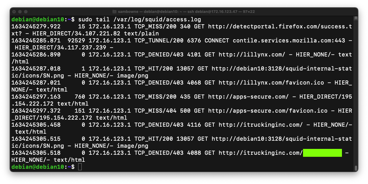 lillynx .comTo see the flag, execute this command, which shows the squid logs. Find the last portion of the second request to "itruckinginc.com".