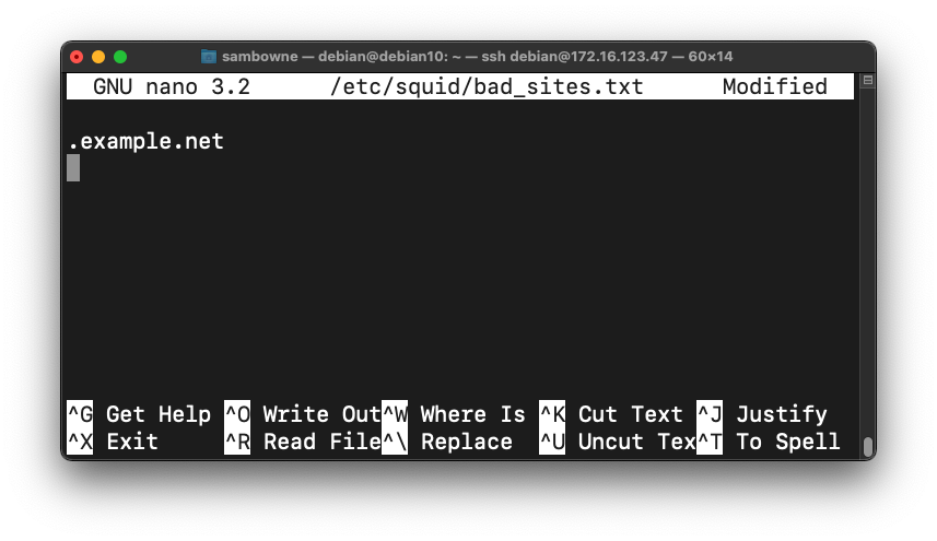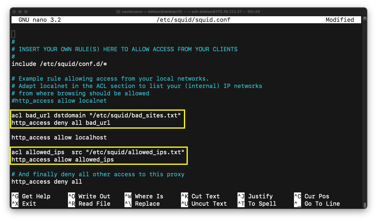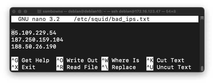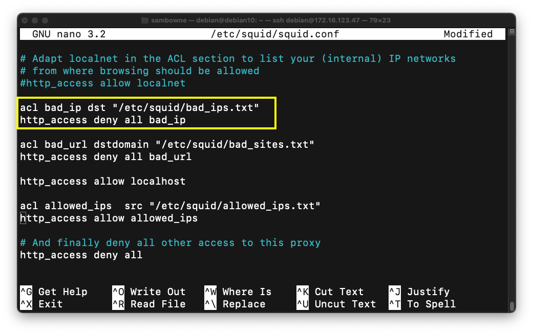 Adjust the Squid configuration line to use the bad_ips.txt file, adding the two lines outlined in yellow in the image below.